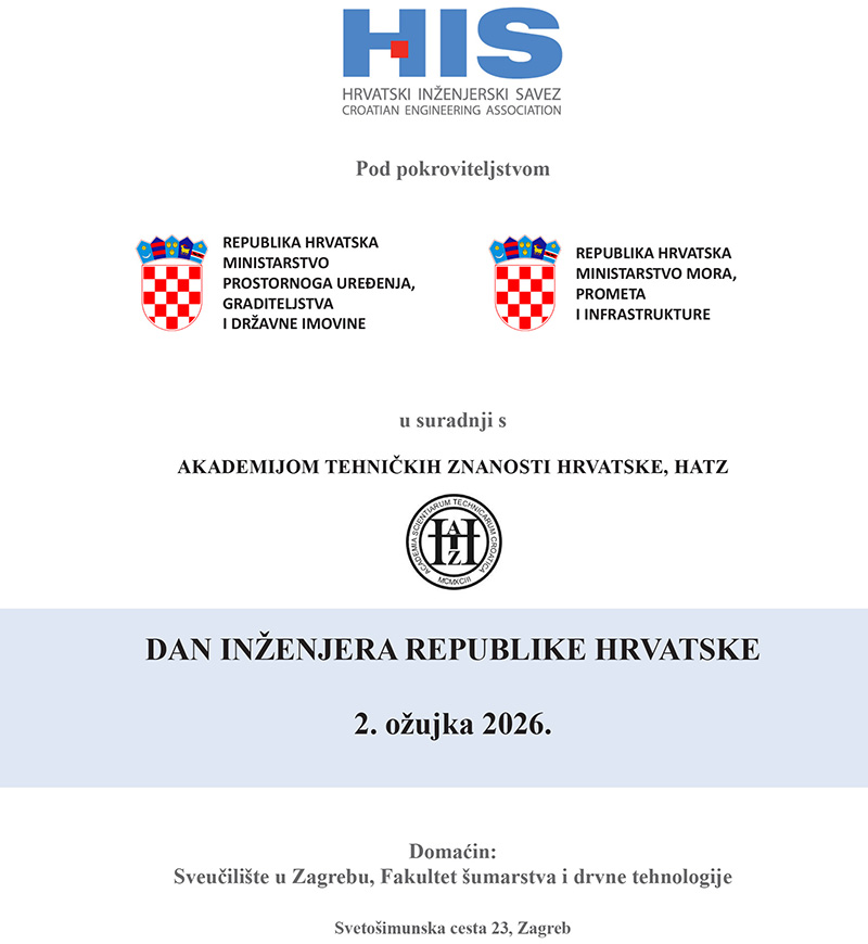 Hrvatski inženjerski savez s ponosom najavljuje održavanje Dana inženjera Republike Hrvatske 2026., središnje nacionalne manifestacije posvećene hrvatskoj inženjerskoj struci, koja će se održati 2. ožujka 2026. godine s početkom u 9:30 sati na Fakultetu šumarstva i drvne tehnologije Sveučilišta u Zagrebu, u suradnji s Akademijom tehničkih znanosti Hrvatske i pod pokroviteljstvom Ministarstva prostornoga uređenja, graditeljstva i državne imovine, te Ministarstva mora, prometa i infrastrukture.